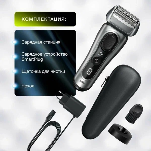 Электрическая бритва Braun Series 8 модель 8517s silver Уцененный товар. Причина уценки - потертая коробка. Товар новый, не бывший в употреблении. Цвет Черный/серебристый Тип электробритвы Сеточная Способ бритья Влажное, сухое Плавающие головки Да Количество бритвенных головок 4 Водонепроницаемый корпус Да Питание Автономное Время автономной работы До 60 мин Индикация Замены ножей, зарядки, необходимости очистки, остаточной зарядки, полной зарядки, разрядки, степени зарядки Особенности Быстрая зарядка, дисплей, для чувствительной кожи, индукционная зарядка, нескользящая вставка на рукоятке, триммер Время зарядки аккумулятора1 ч В комплекте Дорожный чехол, масло для смазки, подставка для зарядки, устройство для зарядки и очистки, щеточка для чистки